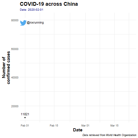 Whilethe true origin of the virus remains debatable, the very first reported covid-19 case was detected in Wuhan City, Hubei Province of China. Since then, the numbers have skyrocketed. Using the numbers reported in the daily situation reports by World Health Organization (WHO), let’s visualise how the outbreak has developed since 1st February 2020 using gganimate on R.