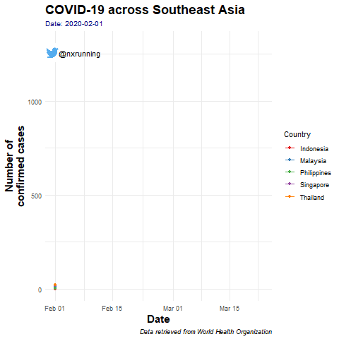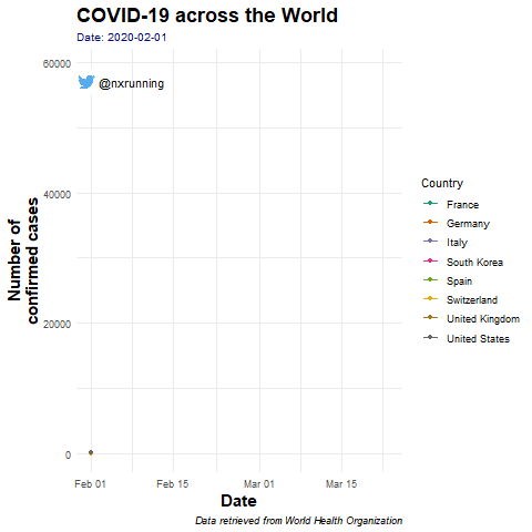Number of infected cases and deaths around the world continues to rise daily. This article visualises how the pandemic has evolved in certain countries using animated line plots on R.