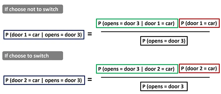 In the context of the Monty Hall problem, we are interested in comparing the probability between switching or sticking to our initial choice of door given that the host chose to open a door with a goat behind. Using the example problem presented above, given that door 3 has been revealed to be a goat, the car would be either behind door 1 (our initial choice) or door 2 (if we choose to switch). To solve the problem, let us apply the Bayes’ Theorem formula and compare P (door 1 = car | opens = door 3) and P (door 2 = car | opens = door 3).