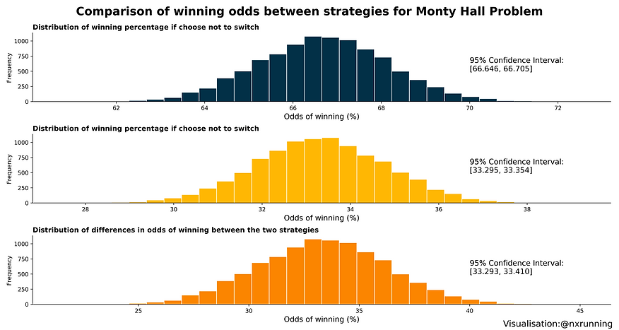 The x-axes of the two histograms clearly indicate the difference in odds of winning between the two strategies. You go home with a car 62-72% of the time if you choose to switch as opposed to 28-38% if you choose not to switch. This is further supported by the 95% confidence intervals computed for both strategies. Within 95% of the sampled winning odds from the 10,000 trials, the frequency of winning if you switch is between 66.646 and 66.705% while sticking to the same door selection would be between 33.295 and 33.354% instead. Since the 95% confidence intervals do not overlap, we can infer that there is a statistically significant difference in winning percentage between the two strategies. Indeed, as illustrated in the third histogram (orange in colour), we are 95% confident that choosing to switch would increase our odds of winning by 33.293 to 33.410%. Therefore, the frequentist approach also supports Marilyn vos Savant’s suggestion to always make the switch if given the choice to.
