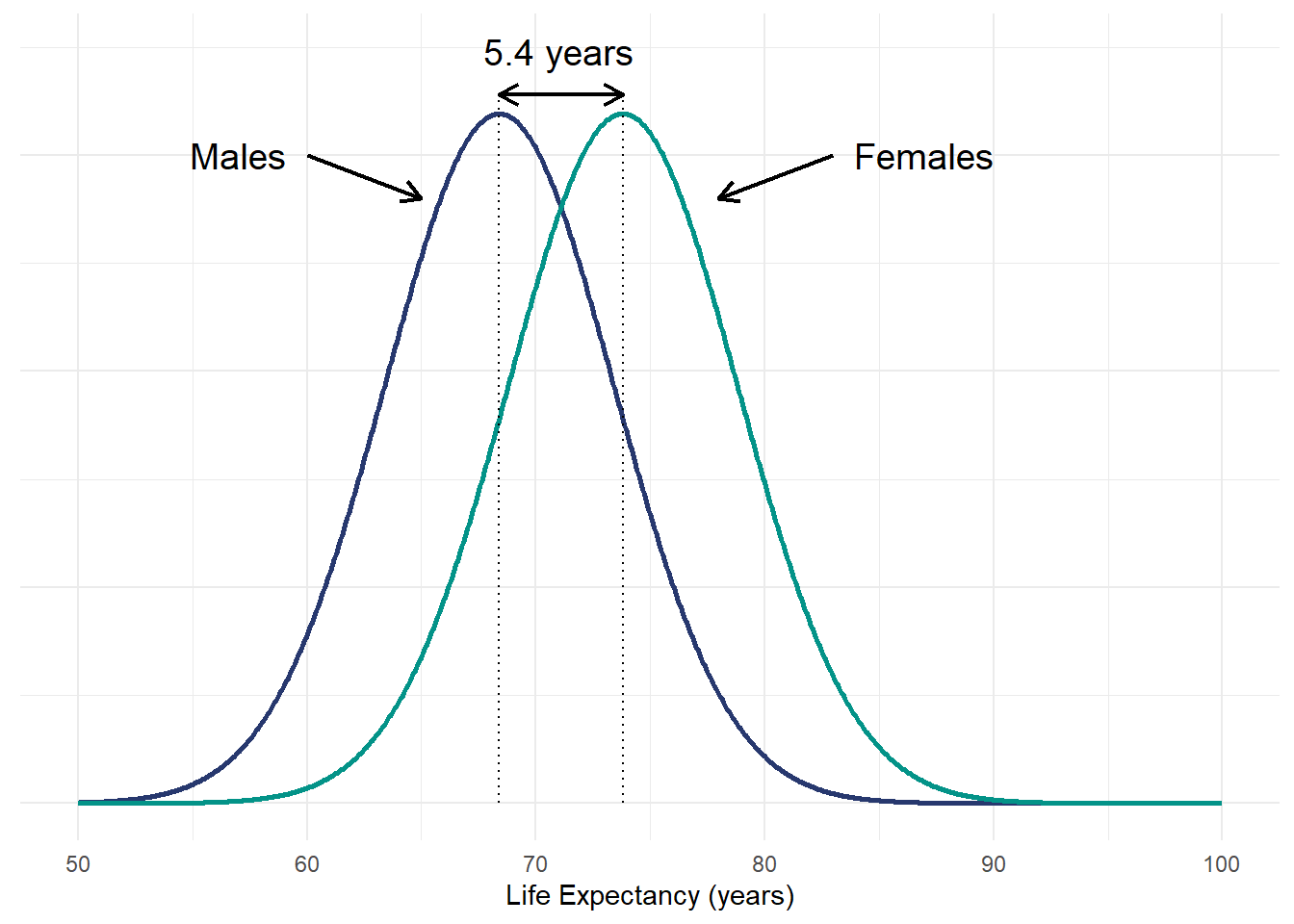 Let’s illustrate this using a simple example of comparing two means based on a t-test. According to Our World in Data, women tend to live longer than men. It was suggested that the average life expectancy of women and men was 73.8 years and 68.4 years, respectively. Assuming a Gaussian distribution and similar variance, the figure below presents the life expectancy distribution of both gender groups.