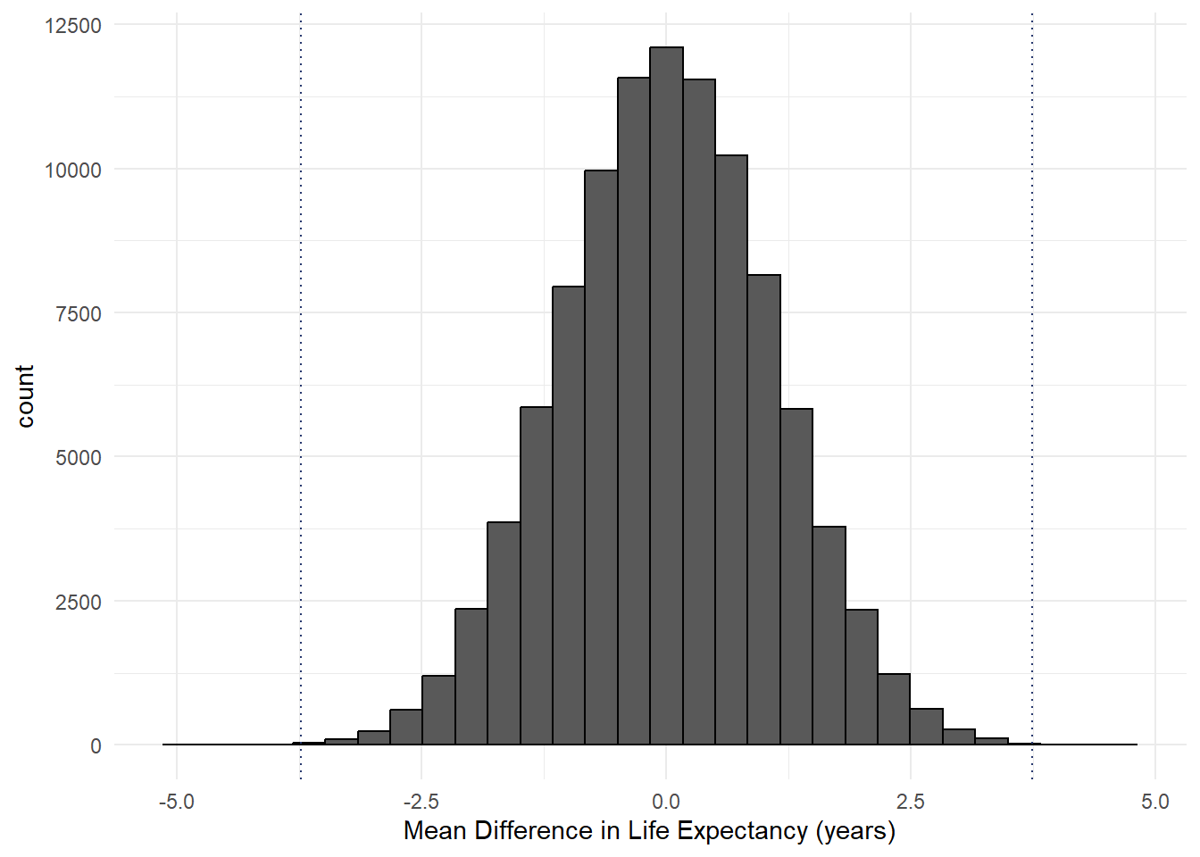Next, we re-run the t-test comparing the mean values between our newly allocated gender groups. The test output below tells us that the new mean life expectancy for women and men is 75.54 years and 75.94 years, respectively. Interestingly, in contrast to our initial result, the random allocation of gender groups results in the mean life expectancy of females being lower than males by 0.40 years. The estimate is also much smaller than the observed mean difference of 3.74 years.