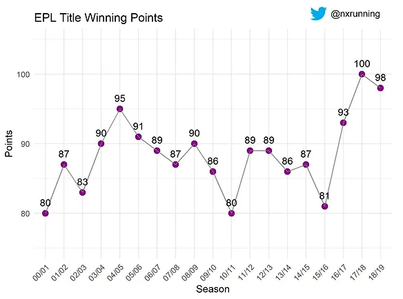 Is he right to say that? This article examines whether the present EPL is indeed getting easier as compared to many years ago. First, let’s visualise how many points were required to become champions across the different past seasons since 2000/2001.