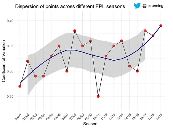 The figure above illustrates the CV across different seasons. Generally, we see there’s relatively greater variation in more recent seasons as compared to the past. For example, there’s 29% variation in 2003/2004 season as compared to 39% variation in 2018/2019. Based on the graph, the most competitive season was probably in 2010/2011 with the least variation of 25%. This suggests that there’s some truth in Robert Pires’s comments.