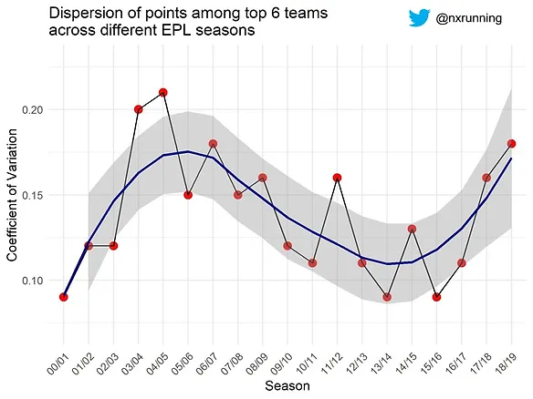 Next, let’s further analyse the competitiveness of the league based on different standings of the table. The figure above illustrates the CV of the top six teams across different seasons. This tells a slightly different story as compared to the previous graph. The higher CVs were observed in 2003/2004 and 2004/2005 seasons, which suggests greater dispersion in point total among the top teams. This implies relatively less of a close battle for the title in these two seasons. In contrast, we see a clear trend of decreasing CV from season 2005/2006 onwards till about 2015/2016. This coincides with the shift of the traditional “Top Four” (Arsenal, Manchester United, Chelsea, Liverpool) dominance to the emergence of the “Big Six” with Tottenham Hotspur and Manchester City joining in to challenge for the title.