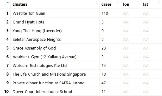 The list of clusters used in this blog post was from the Covid-19 Singapore Dashboard created by Upcode Academy. The dashboard displays several visualisations on data related to the pandemic outbreak in Singapore. On the bottom right of the page, we could see the clusters and their respective number of cases. Data on the cluster list was scraped through the use of rvest package. The web scraping process is similar to the code I have documented in my previous blogpost.