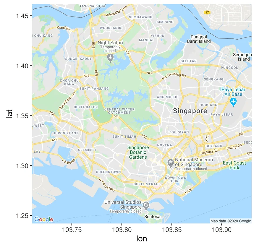 singapore_map <- get_map(singapore_city, zoom = 12, maptype = "roadmap")