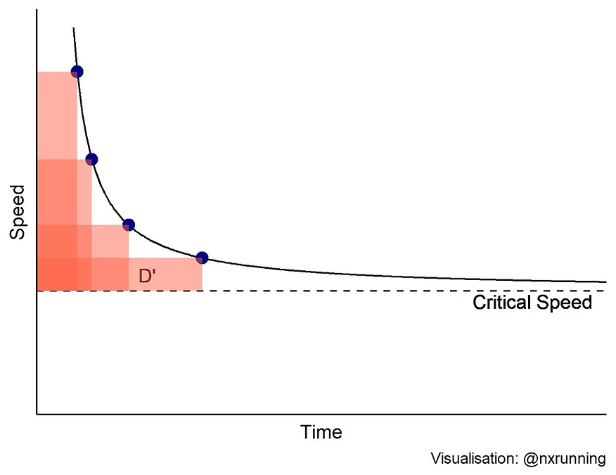 The concept proposes that when one runs at a given speed (S) above the critical speed (CS), the ability to sustain that speed is limited by the individual’s work capacity (D’). For example, a runner has a CS of 5 m/s and D’ of 200m. If this runner attempts to run at a speed of 7 m/s, it is expected that he or she will reach exhaustion in 100 seconds (as calculated by 200/ (7-5) = 100).