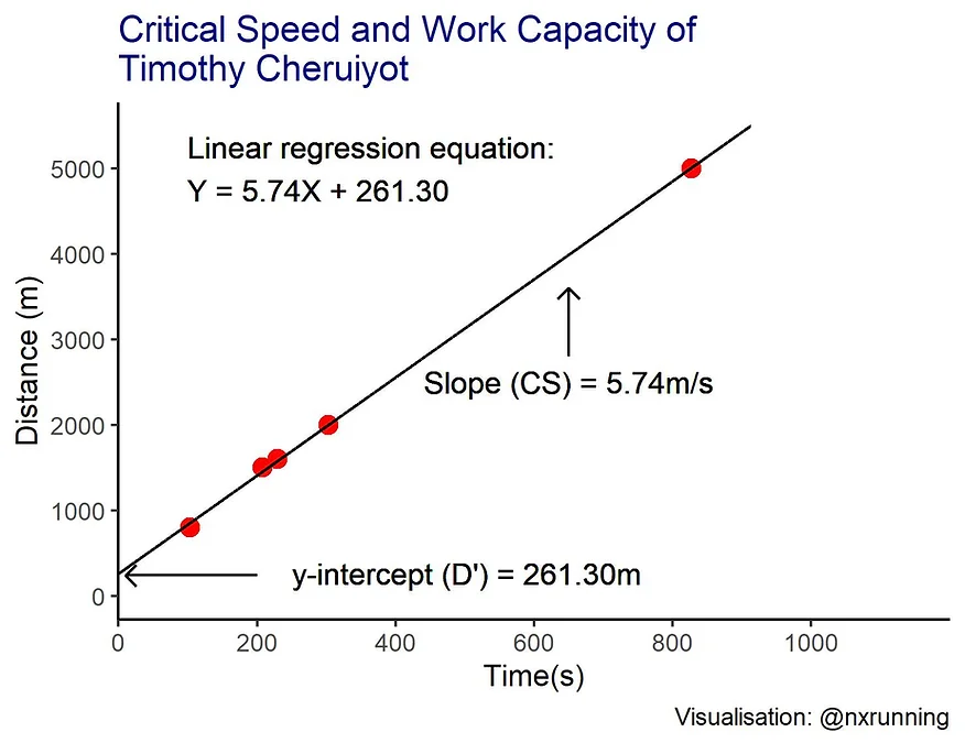Given that it requires some effort to interpret a hyperbolic curve, an easier and commonly used method to calculate CS and D’ is to plot the total work done (distance of event) against the time duration, which has a linear relationship. Next, we fit a linear regression line to the values and interpret the values from the straight-line equation. The slope or gradient of the line represents CS, while the y-intercept represents D’. The figure below illustrates an example of this method to calculate the CS and D’ of Timothy Cheruiyot, who is currently first ranking in the men’s 1500m event. I plotted his personal best records between 800-5000m (data from IAAF database) and derived the linear regression equation based on these values. The slope of the equation informs us that his CS is 5.74 m/s, and the y-intercept informs us that his D’ is 261.30 metres.