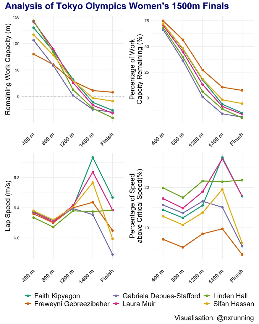 The critical section of the race was at the 1200m mark, in which runners tend to compete for the final sprint to the finish line. As purported by the concept of CS, information on remaining D’ may tell us the ability of athletes to further push their pace as well as the sustainability of their efforts. The medallists had greater D’ remaining and led the charge in the last lap, with Kipyegon and Muir running the section between 1200 and 1400m at an impressive speed of 27% above CS. In contrast, as shown in the figure, Debues-Stafford started slowing beyond 1200m as her D’ went into the negatives. By the 1400m mark, 5 out of the front 6 runners had emptied their tanks and slowing down of the speed for the final 100m was observed.