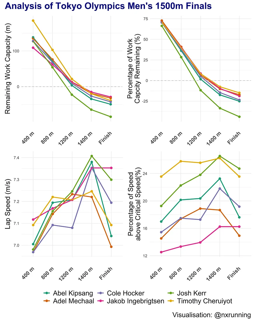 Cheruiyot initiated the sprint in the last lap at a pace 25% above his CS, but he was unable to sustain his efforts over the last 100m. Ingebrigtsen displayed his superior physiology as he matched Cheruiyot’s pace and managed to maintain that through the finish line. This suggests that Ingebrigtsen’s present fitness level is likely higher than what we have estimated. Another surprising performance was from Kerr, who was the bronze medallist. As shown in the figure, his average effort over the race was 24% above his estimated CS and he was predicted to empty his tank by 1200m mark. However, he showed an incredible performance in the last lap, running at a speed faster than Cheruiyot and Ingebrigtsen. Based on his estimated D’, his actual efforts would have over-depleted his D’ by 44%. Certainly, he is way fitter than what was estimated.