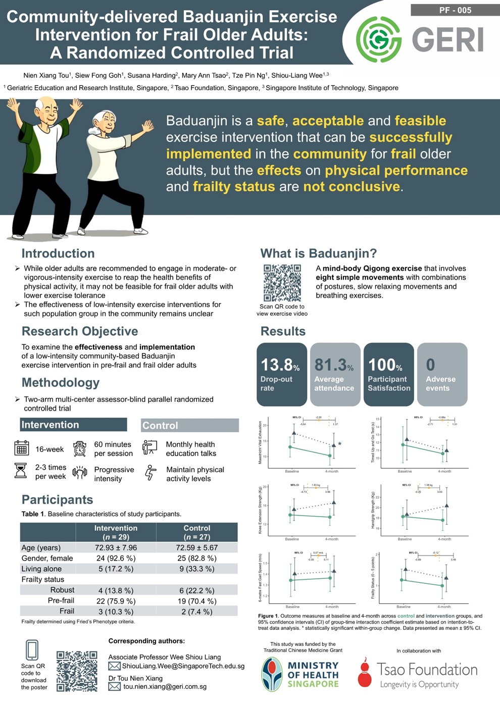This poster presentation presented the preliminary findings of a randomised controlled trial evaluating the effectiveness of a community-based Qigong exercise intervention for frail older adults. The study has been published in European Review of Aging and Physical Activity. You may access the full-text here.
