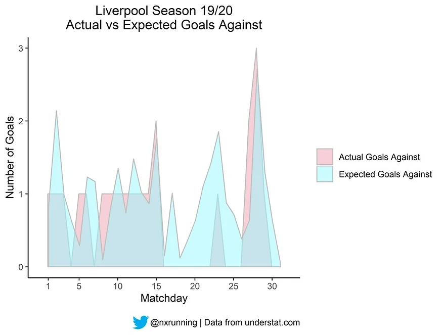 The visible grey areas indicate that Liverpool registered more actual goals than expected in some occasions. While the disparity between the two areas is mostly quite small, such differences suggest that Liverpool had luck on their side on top of their performances. The most notable gap was on matchday 15, whereby Liverpool faced Everton in the Merseyside derby. Liverpool scored 5 goals, twice the xG statistic of 2.41. Aggregation of xG revealed that Liverpool was expected to score 64.25 goals, which is less than the 70 goals they actually scored.